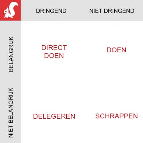 Belangrijk duidt vooral op zaken die je niet moet vergeten. Ze moeten gebeuren, maar niet per se direct. Dit omvat het grootste deel van je werk. Meestal kun je deze zaken plannen en erop anticiperen op een proactieve manier.